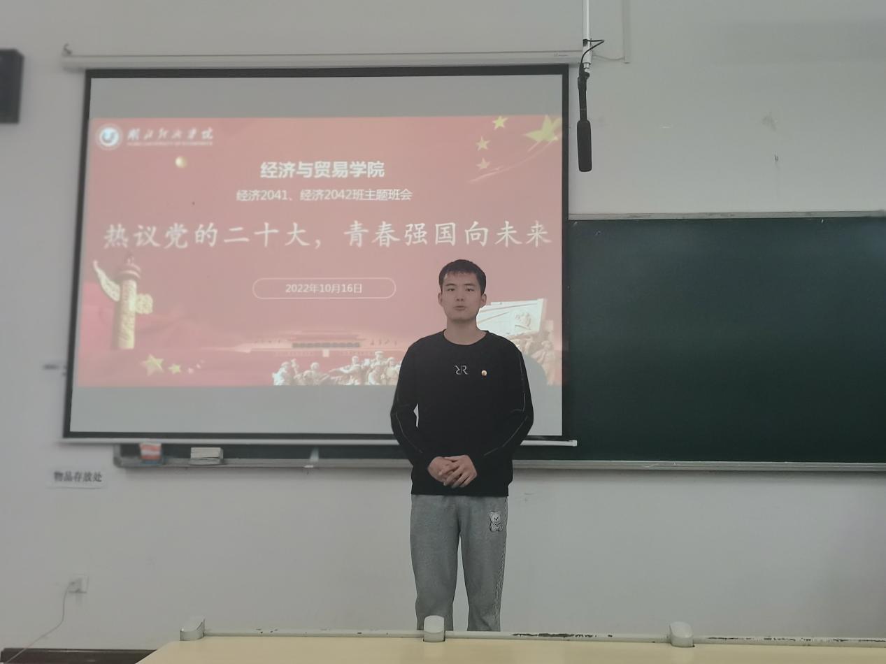 经济学2041班退伍军人刘凯锐以党的二十大报告“努力提高居民收入在国民收入分配中的比例,提高劳动报酬在初次分配中的比重”为切入点,指出研究经济学,目的就是要通过优化资源配置,最大限度满足人们的需要。分蛋糕和做蛋糕一样重要,我们追求效率的提高与经济的发展,本质是让每一个人的生活水平更高,质量更好。党和国家制定一系列的分配政策,既保证效率,又兼顾公平,在提高人民生活水平的同时,也促进经济的健康发展。