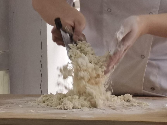 老师以较为简单的饺子为本次的烹饪作品,先给同学们示范讲解“和面、揉面、饧面、基础馅心调制、搓条、下剂、制皮、上馅成形、熟制”九道工序。潘腾同学谈到:“在课堂上我了解了许多不曾熟知的楚式面点,学习了在制作面点时的一些小技巧。比如如何让面粉更有弹性,如何擀出好的面皮以及如何去掉腥味。在老师边讲解边示范制作的过程中我明白了烹饪的过程远比我们想象的要漫长,不论是面团还是食材都要经过长时间的处理。任何事物的完成都不能一蹴而就!”