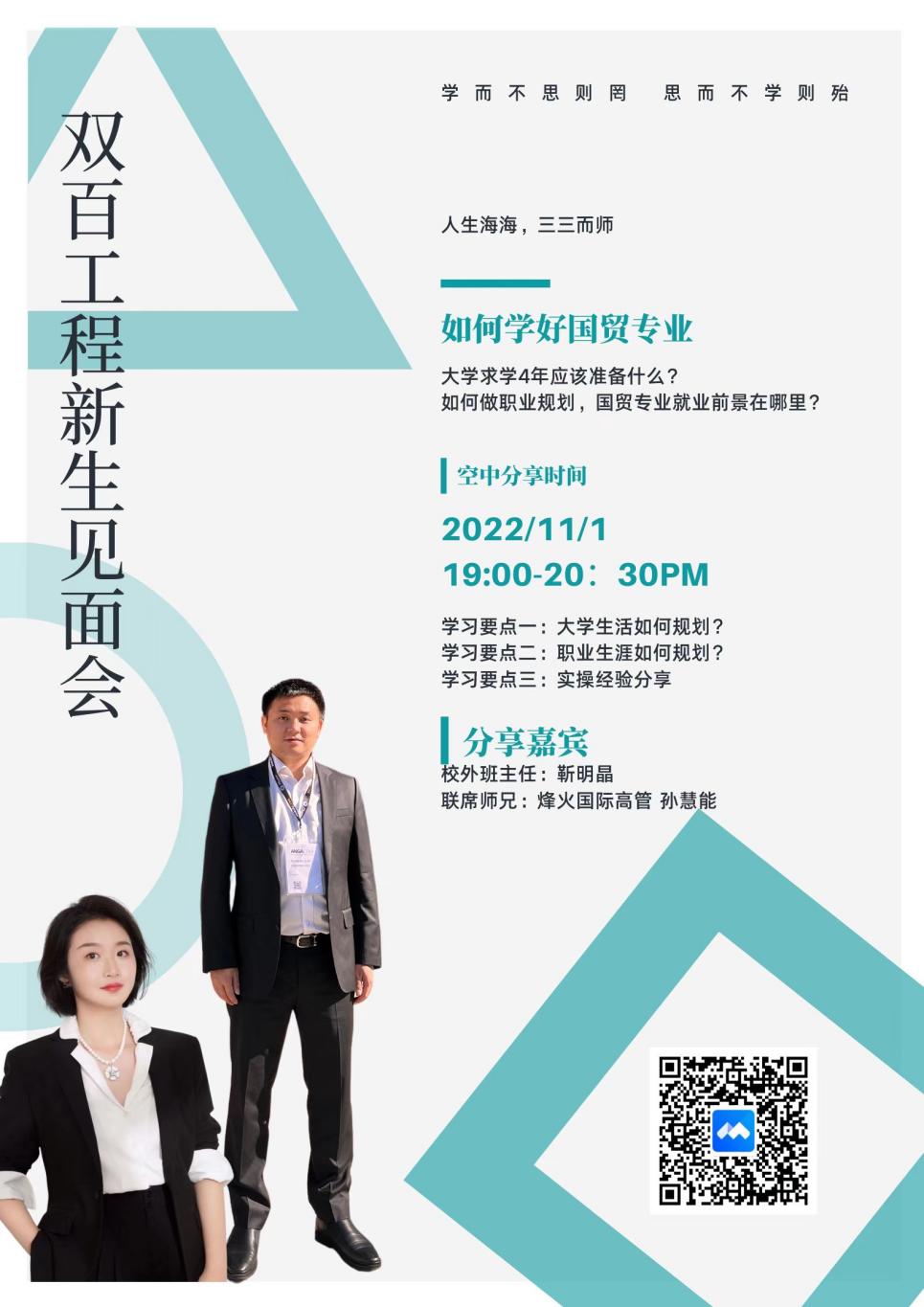 11月1日,国贸2241班的荣誉班主任友邦人寿保险有限公司业务经理靳明晶受邀参加线上课堂,她从大学生活、职业生涯发展和个人选择三个方面为同学们进行分享。她着重强调了英语学习的重要性,鼓励同学们学好英语,多参加英语角联系去提升自己的英语能力。为给予同学们更多有益的建议,她还邀请到国贸行业经验丰富的好友烽火国际高管孙慧能为同学们分析了国贸行业的就业形势、介绍了就业方向、传授了就业经验,帮助国贸专业的新生同学们做好求学准备和职业规划。