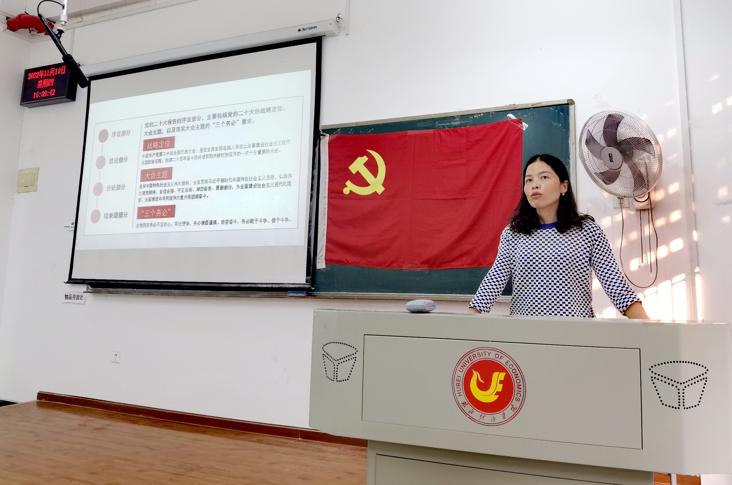 支部书记宣布到场情况和纪律要求,并带领全体同志奏唱国际歌。组织委员报告11月份党费交纳情况,经贸学院学生党总支书记、辅导员祝琴同志领学党的二十大报告、决议和内在逻辑。祝琴将党的二十大报告拆分为序言、总论、分论和结束语四个部分,从战略定位、大会主题、实践基础、理论指导、基本路径、根本保证和团结要求七个方面切入,引经据典、旁征博引、结合实际系统地分析了报告的内涵和外延。