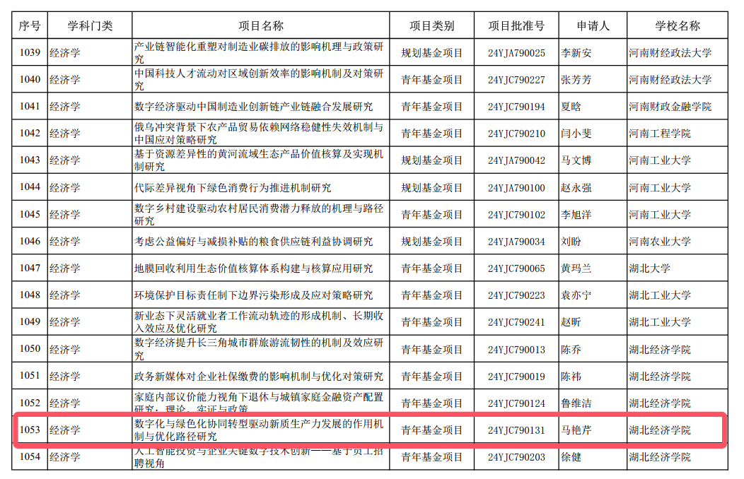 日前,教育部社科司发布《2024年度教育部人文社会科学研究一般项目立项的通知》,我院青年教师马艳芹博士申报的《数字化与绿色化协同转型驱动新质生产力发展的作用机制与优化路径研究》获批青年基金项目,本次立项为必威中文官网电话查询2024年科研工作注入了新动力,学院将继续做好有组织的科研活动,助力应用经济学学科高质量发展。