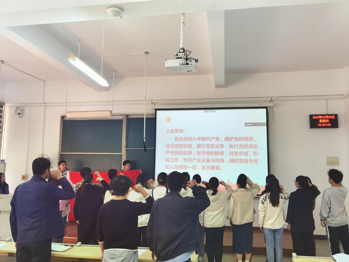 本网讯(通讯员陈紫扬)3月9日下午,我院学生党总支在J2-101举行了预备党员宣誓大会。学院党委书记彭红波、组织员王水斌、学院辅导员左寅生、吴鹏出席,全体学生党员参会,会议由学院学生党总支书记祝琴主持。