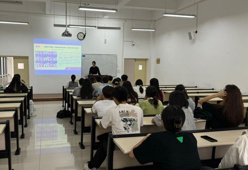 本网讯(通讯员崔子菡)为深入学习贯彻党的二十届三中全会精神,深化“悦学习·跃青春”思政工作品牌,2024年10月17日下午,我校“经叹号”青年宣讲队成员朱芸可来到经济2441班团支部开展《进一步全面深化改革,推进中国式现代化——党的二十届三中全会精神解读》主题宣讲,向同学们全面讲解党的二十届三中全会精神内涵以及意义,让大家对中国式现代化重要战略部署有了更深刻的认识。