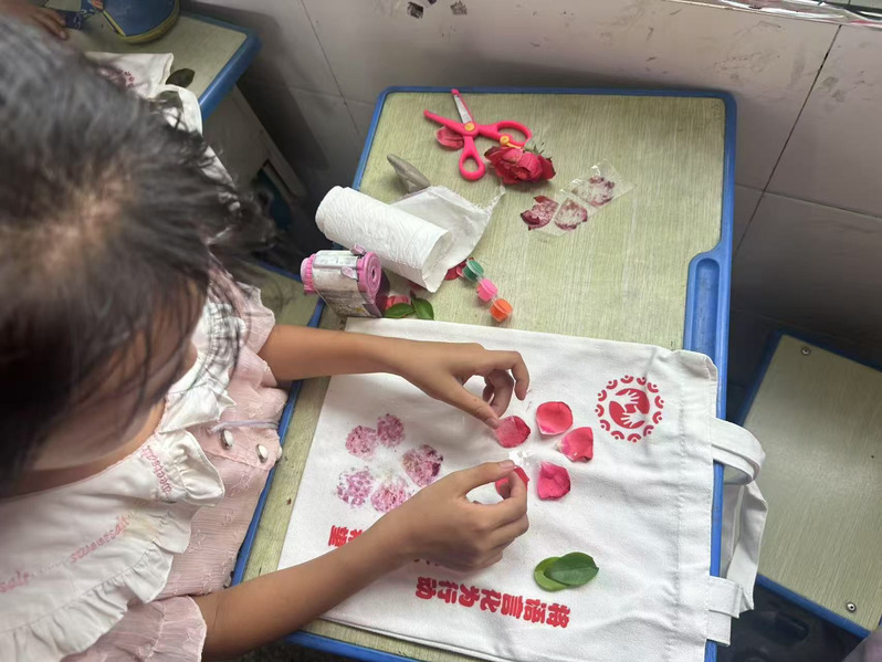一年级学生任盈鑫兴奋地说:“把树叶变成花纹好神奇!我要把这块布送给妈妈。”活动现场,支教老师陶晶晶介绍:“拓染是国家级非遗技艺,我们希望通过动手实践,让孩子们感受传统文化的魅力,在心中种下守护非遗的种子。”