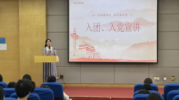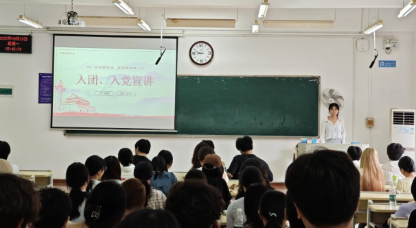 为加强新生思想政治引领,增进青年学生对党团组织的认识和理解,引导其坚定理想信念,9月15日,我院在大学生活动中心三号报告厅及一号教学楼成功举行了2025级新生入团入党启蒙教育宣讲会,宣讲由学院党委副书记丁升和辅导员陈雪颖主讲,全体2025级新生参加活动。