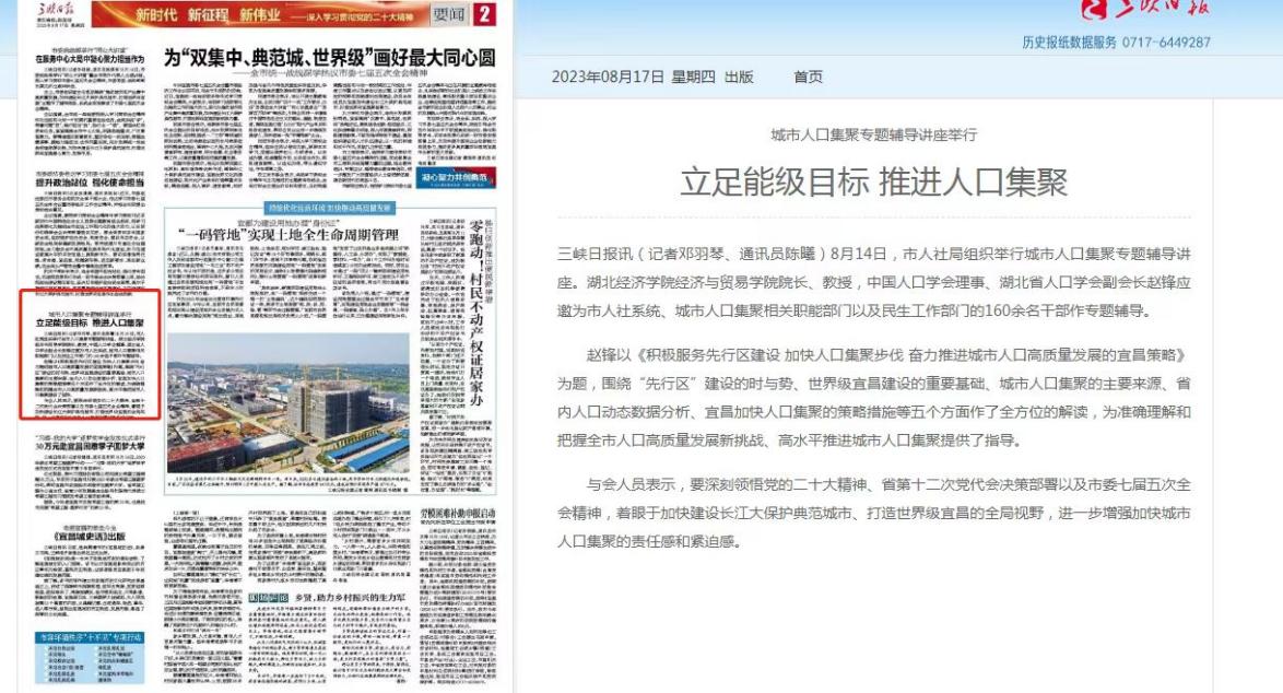三峡日报、宜昌电视台等多家媒体对本次报告会给与关注和宣传。与会人员认为,本次报告政策讲解思路清晰,数据事例分析详实具体,对深刻领悟党的二十大精神、省第十二次党代会决策部署以及市委七届五次全会精神,着眼于打造世界级宜昌,加快城市人口集聚,具有积极的推动作用。