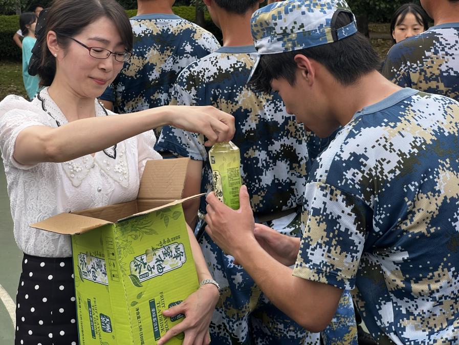 院领导等一行与新生亲切交谈,关心学生们的身体状况及参训感受,并向教官了解新生们的参训情况。随后,院长赵锋鼓励同学们,军训的目的是培养同学们艰苦奋斗的精神品质和自理自立的生活习惯;同时,他强调,在9月18日这个特殊的日子里,同学们应当铭记历史、勿忘国殇,传承革命精神,树立鸿鹄之志;此外,他指出,同学们来自五湖四海,而如今相聚经院,既是一种缘分,更是一种机遇,希望同学们能够不负时光,用奋斗和汗水谱写好新时代的青春之歌。最后,学院领导及教师为军训新生们送上了慰问物资,氛围和谐融洽。