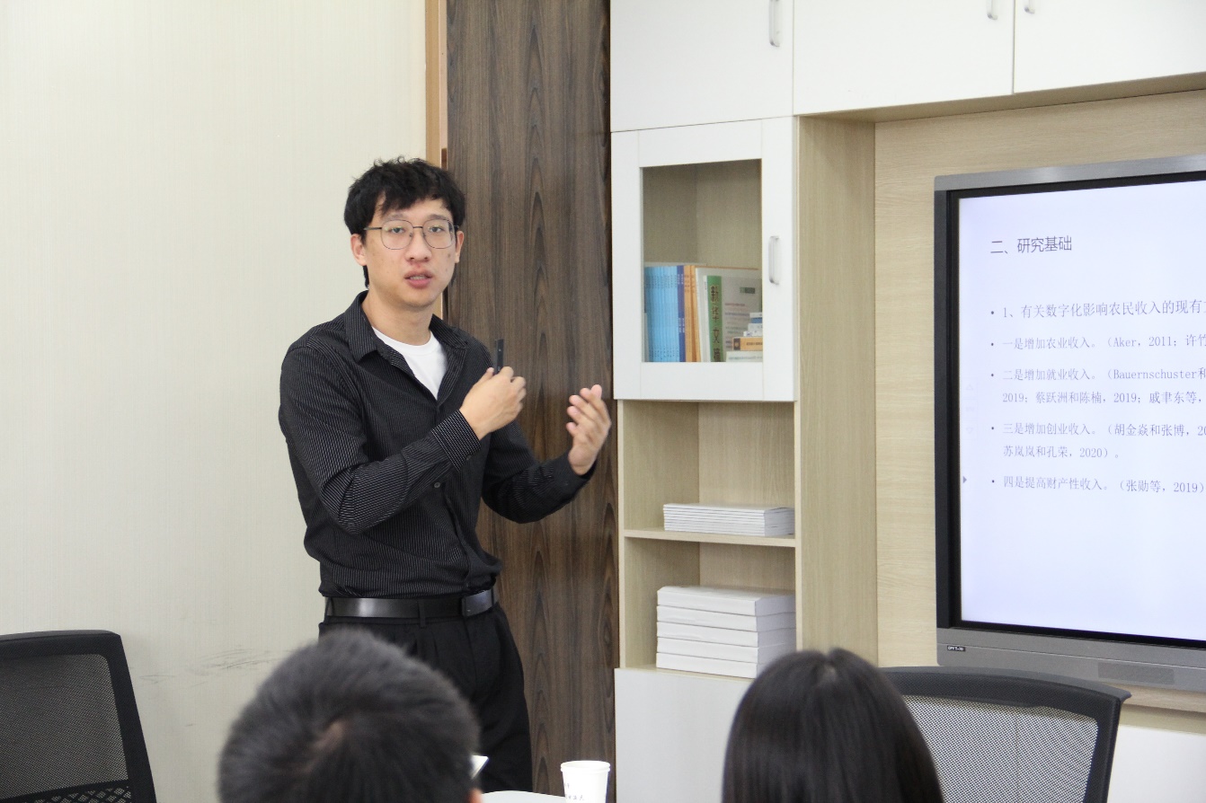 来自青年学术沙龙国际贸易方向和数量经济方向和财政与公共管理学院的老师参加了本次会议。刘东老师以 “数字乡村建设、认知能力与农村居民收入增长”为主题,对自己团队的工作论文进行了汇报。谭辉教授对论文的选题和工作量作了充分肯定,并提出了相关修改意见。