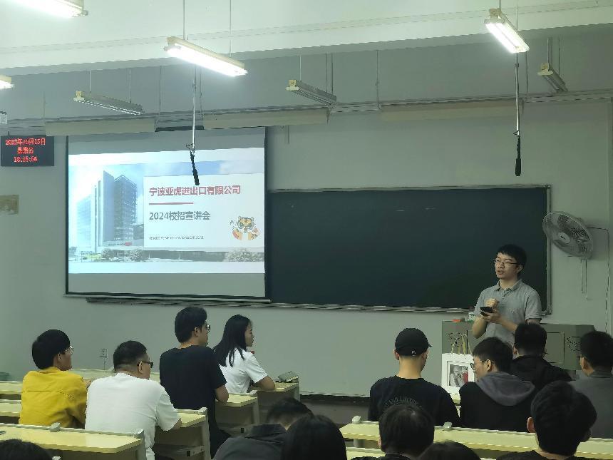 10月15日晚,宁波亚虎进出口有限公司在J2-405教室举办2024年校招宣讲会,该公司人力资源部经理王奕兴主讲,我院国贸2041班和国贸2042班班主任潘莹老师主持,两个班全体学生参加宣讲会。