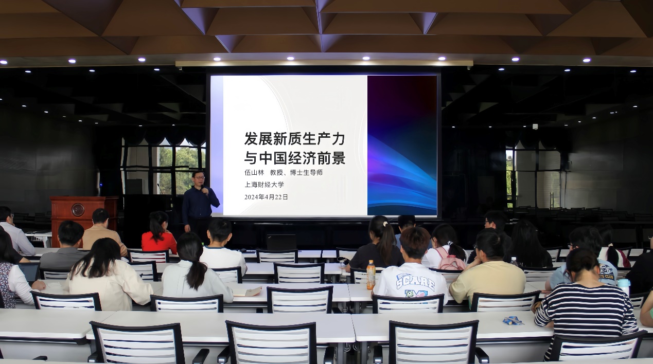 2024年4月22日,由科研处主办,必威中文官网电话查询承办的藏龙讲坛2024年第七讲在教五1号报告厅举行。本次报告特邀上海财经大学经济学院讲席教授、博士生导师伍山林教授作“发展新质生产力与中国经济前景”为主题的报告。会议由陶珍生副院长主持,来自经贸、低碳学院等院系的老师和学生60余人参会。