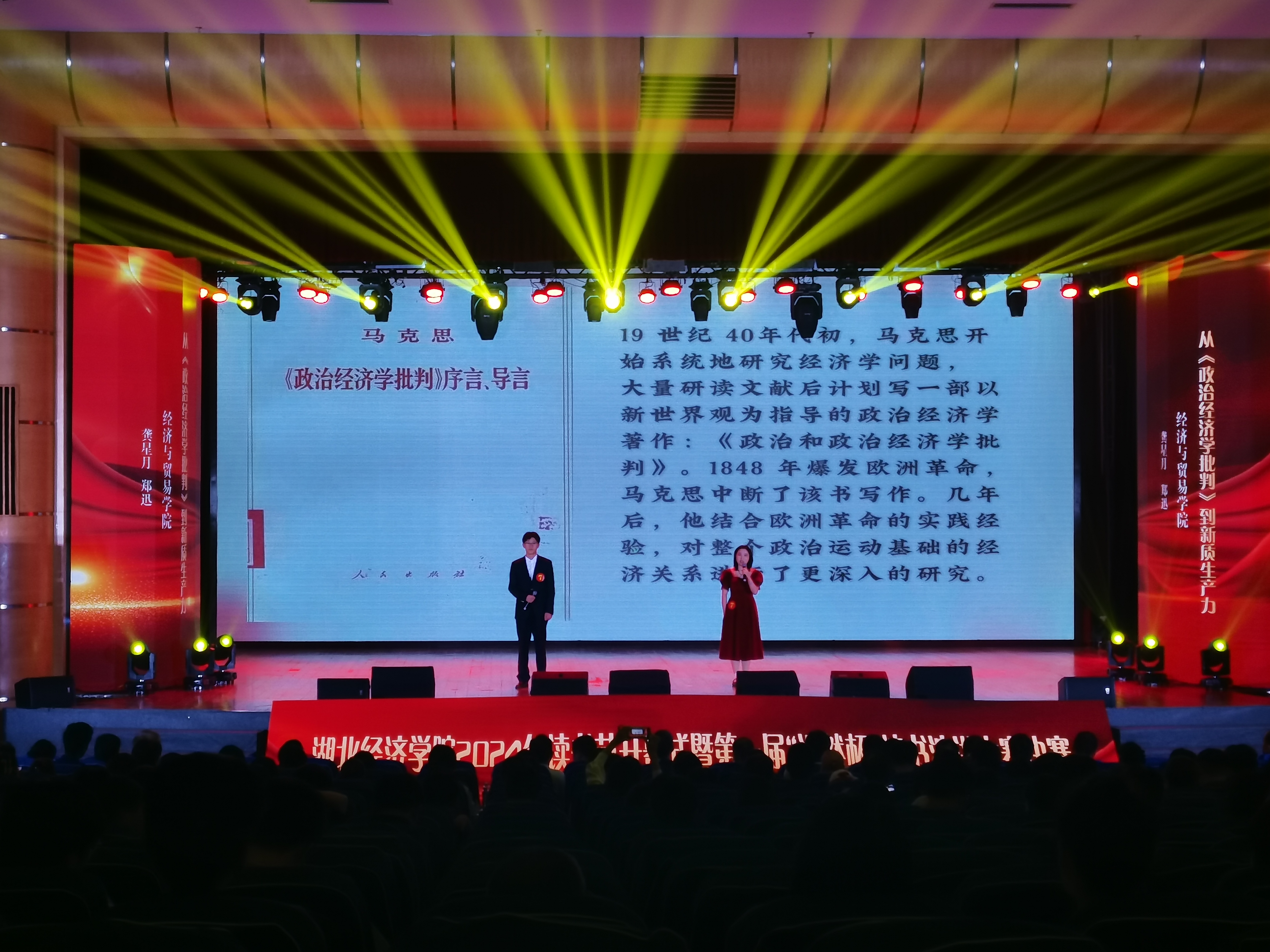 由我院党委副书记丁升指导的学生团队从全校19个院系团队中脱颖而出闯进决赛,最终取得了校级二等奖的佳绩。该学生团队由我院商经2141班龚星月、国贸2142班李小红、国贸2241班郑迅、国贸2341班余樟玥、经济2341班王佳敏组成。团队作品选自伟大的政治家、经济学家卡尔·马克思的经典著作《政治经济学批判(序言)》,作品深刻地凸显了马克思政治经济学基本原理同中国社会主义创新和实践相结合在生产力发展方面的优越性。