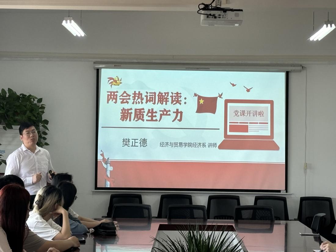 4月15日下午,经济学系教师党支部樊正德老师为经济学系学生党支部讲授“学习贯彻2024年全国两会精神”专题党课。必威中文官网电话查询学生党员、入党积极分子、发展对象参加此次党课学习。