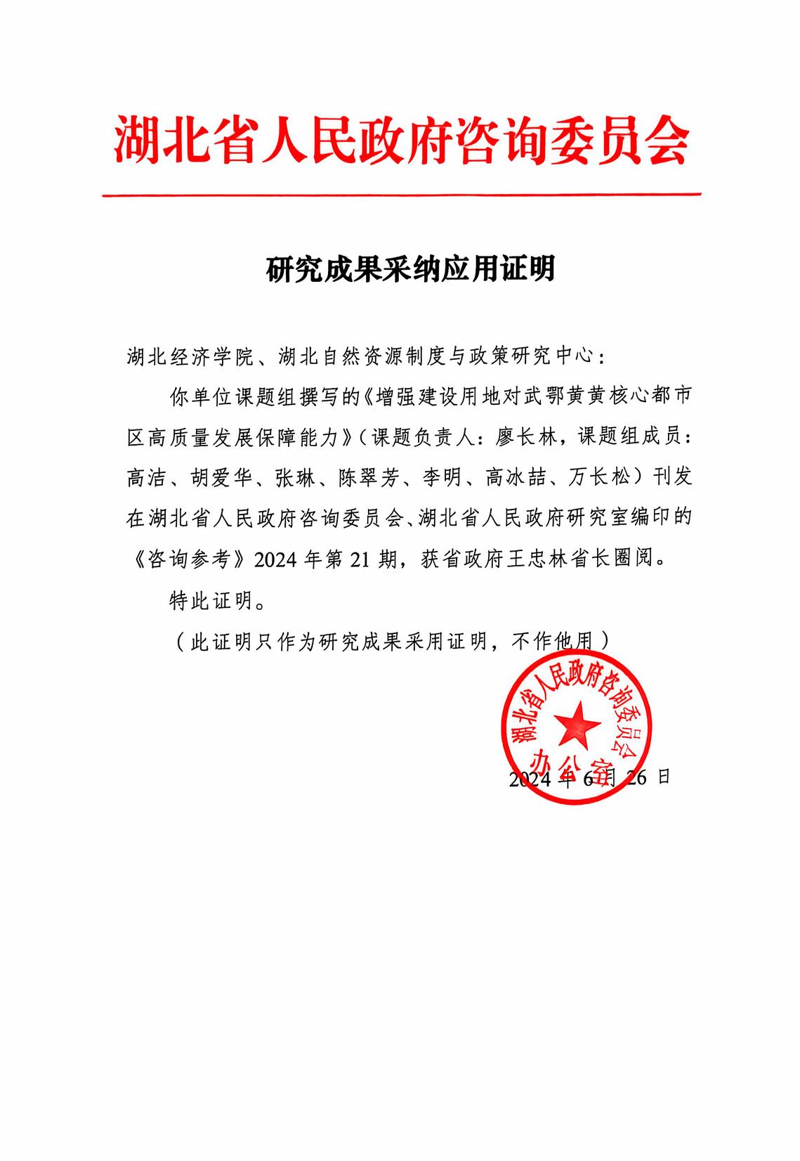 2024年6月26日,湖北省人民政府咨询委员会向betway唯一官网、湖北自然资源制度与政策研究中心发来研究成果采纳应用证明,由高洁教授作为主要成员的课题组撰写的调研报告《增强建设用地对武鄂黄黄核心都市区高质量发展保障能力》,刊发在湖北省人民政府咨询委员会、湖北省人民政府研究室编印的《咨询参考》2024年第21期上,获省政府王忠林省长圈阅。